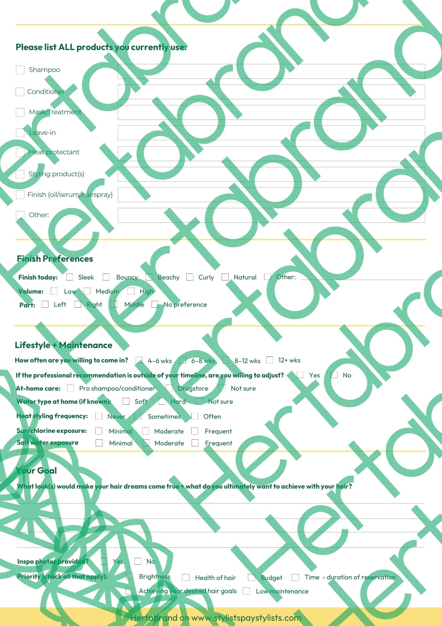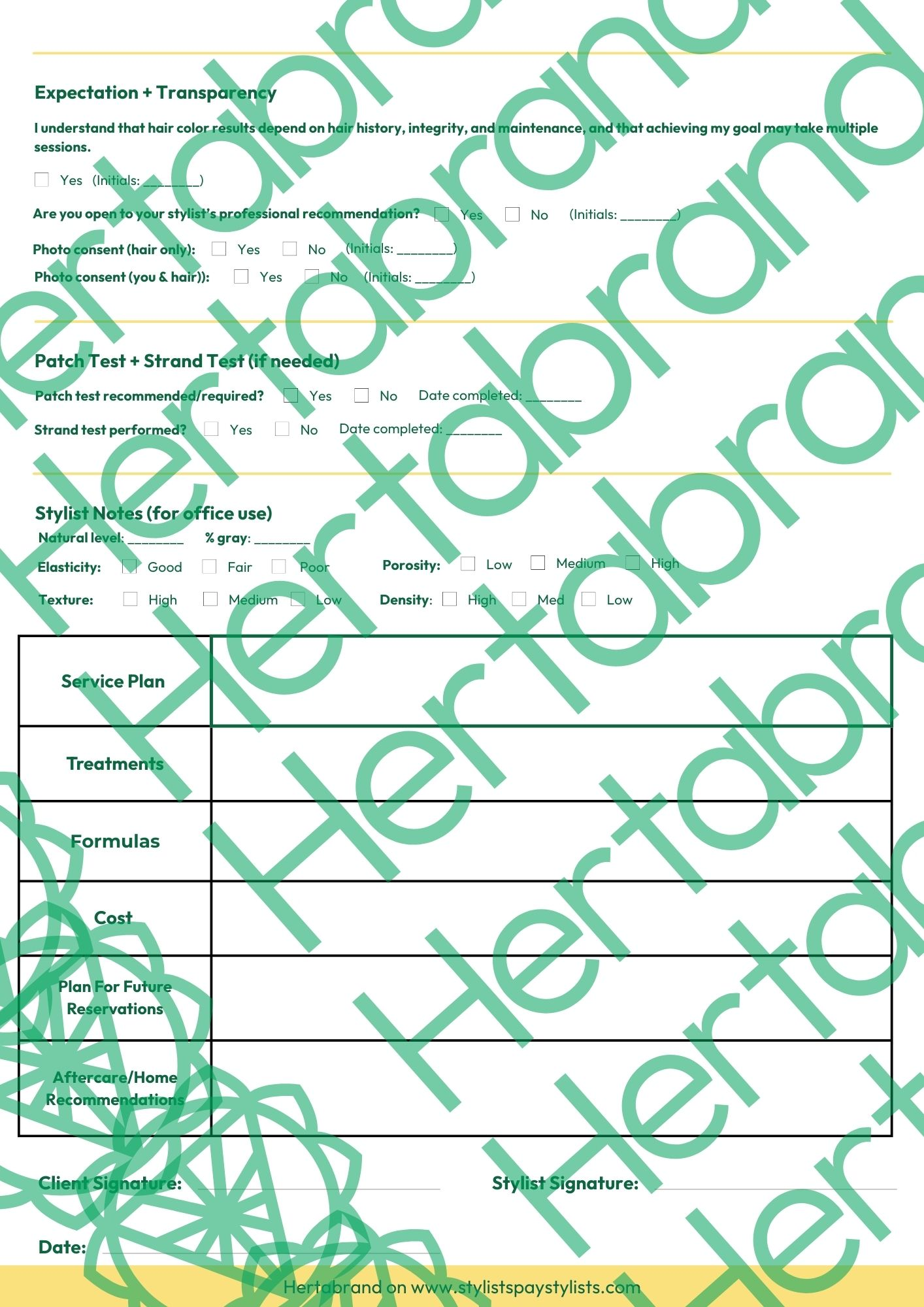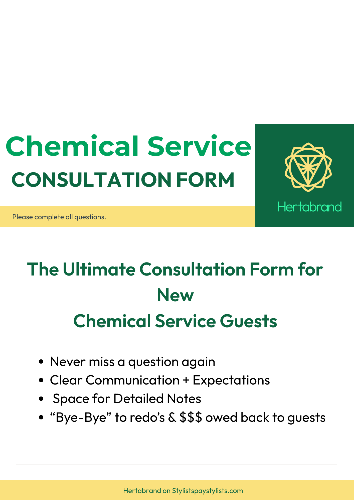 The New Guest Chemical Service Consultation Form by Hertabrand is a professional, high-end consultation + documentation system designed for hairstylists who want consistency, clarity, and confidence with every new color guest—especially in a world where “a quick color” can turn into a costly correction if expectations aren’t aligned.